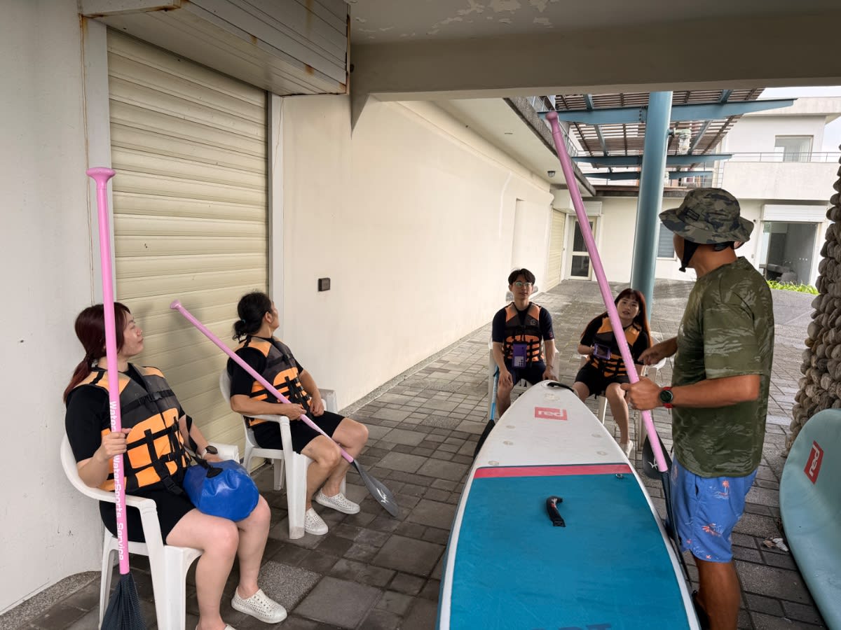 場地環境水行者教學基地 × SUP 海洋課程現場📷 +5課前於場地進行系統化講解,學員穿著救生衣就位,教練逐步說明立槳姿勢、平衡要領與水域安全規範,確保每位學員帶著正確觀念下水。以立槳板實物搭配彩色標記柱示範動作路線,結合視覺輔助工具讓技術說明更直觀易懂,大幅降低初學者的入門門檻。教學場地鄰近水行者海洋運動中心(WATERMAN),備有完整裝備與遮陽空間,從陸上課到下水體驗一站完成,流程順暢安全。